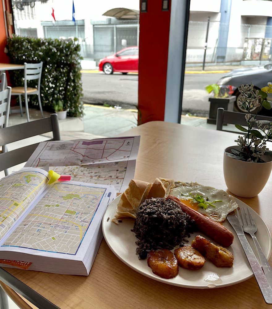 Frühstück im Hotel war gut, gleich eine Spezialität des Landes kennen gelernt, Gallo Pinto: Reis mit schwarzen Bohnen, Spiegelei mit Koriander, Baguette, Würstchen, Koch Bananen, ein traditionelles Frühstück der Region, gibt es bestimmt morgen auch wieder für mich 😋