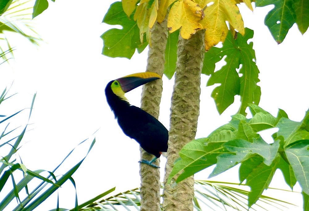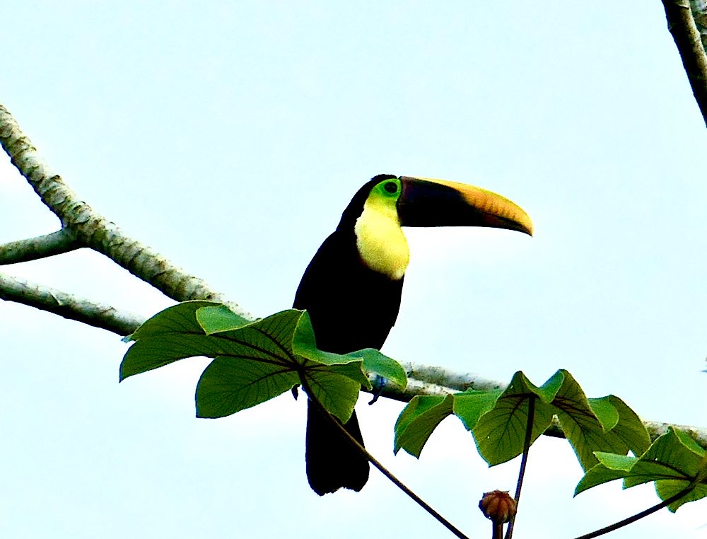 Ich gewöhne mich so langsam ein ins Dschungelleben. Nach dem Aufwachen beim ersten Blick aus dem Fenster sind da Kapuzineräffchen. Gestern Abend hab ich meinen ersten Tukan gesehen, womit ein sehnlicher Wunsch auch ohne Betreten eines Nationalparks hier in Erfüllung ging. Leider saß der Gute in beträchtlicher Entfernung auf geschätzten 35-40m Höhe, also doch recht weit weg. Mit etwas Nachbearbeitung ist das Foto aber noch brauchbar, denke ich und inzwischen weiß ich, wie die nächsten Fotos besser werden 😉