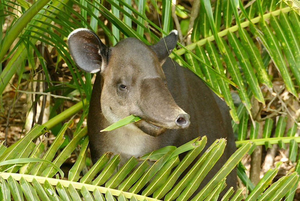 Ich war einigermaßen nervös vor dem Nationalpark, da ich wusste, dass die Wanderung hart sein soll. Die zwei Kanadier, die auch noch dabei sein sollten, hatten kurzfristig gecancelt. So war ich dann doch alleine mit meinem Guide, Angel. Er hat einen beachtlichen Redefluss, die anderthalb Stunden der Fahrt über Stock und Stein, auf sehr schlechter Straße, durch einige Flussläufe, unterhielt er den Fahrer permanent. Dieser brauchte nicht viel zu sagen und tat es auch nicht. Um 7:40 Uhr ging es schließlich in Carate am Flughafen los. Also an der Landebahn, vom Flughafen sah man sonst nichts. Nach 1 Stunde waren wir dann in La Leona, Eintritt in den Nationalpark, registrieren und so weiter, schon 3,5 km geschafft, anstrengend, aber ging. Meine Hochrechnung, wann wir etwa ankommen könnten, ging nach hinten raus dann aber gar nicht auf. Der Weg wurde immer beschwerlicher, entweder in der Hitze am Strand durch den tiefen Sand oder auf dem Parallelweg, zunächst noch eben, später extrem wellig. Unterwegs wurde immer mal wieder Halt gemacht, wenn Angel etwas entdeckt hatte. Das Teleskop, dass alle Guides mit sich führen, wurde dann aufgestellt und etwas scharf gestellt, manchmal war’s dann aber auch schon wieder weg, zumindest bei den Vögeln und Affen war das so. Von den vier Affenarten, haben wir drei gesehen, den Mono Congo nicht, nur gehört, aber den kannte ich ja schon. Das absolute Highlight war aber eine Begegnung am Strand. Angel meinte, ich solle mal meine Kamera aus dem Rucksack holen. Habe ich brav gemacht, hat sich absolut gelohnt: am Waldrand graste ein junger Tapir, absolut entzückend und auch ein wenig fotogen. Also, grasen war es eigentlich nicht was er tat, er fraß Palmenblätter, war in aller Ruhe und mit Leib und Seele am Futtern. Zwei Franzosen waren auch gerade da, drei Kameras, er ließ sich nicht stören, erst als er satt war, ging es weiter.
