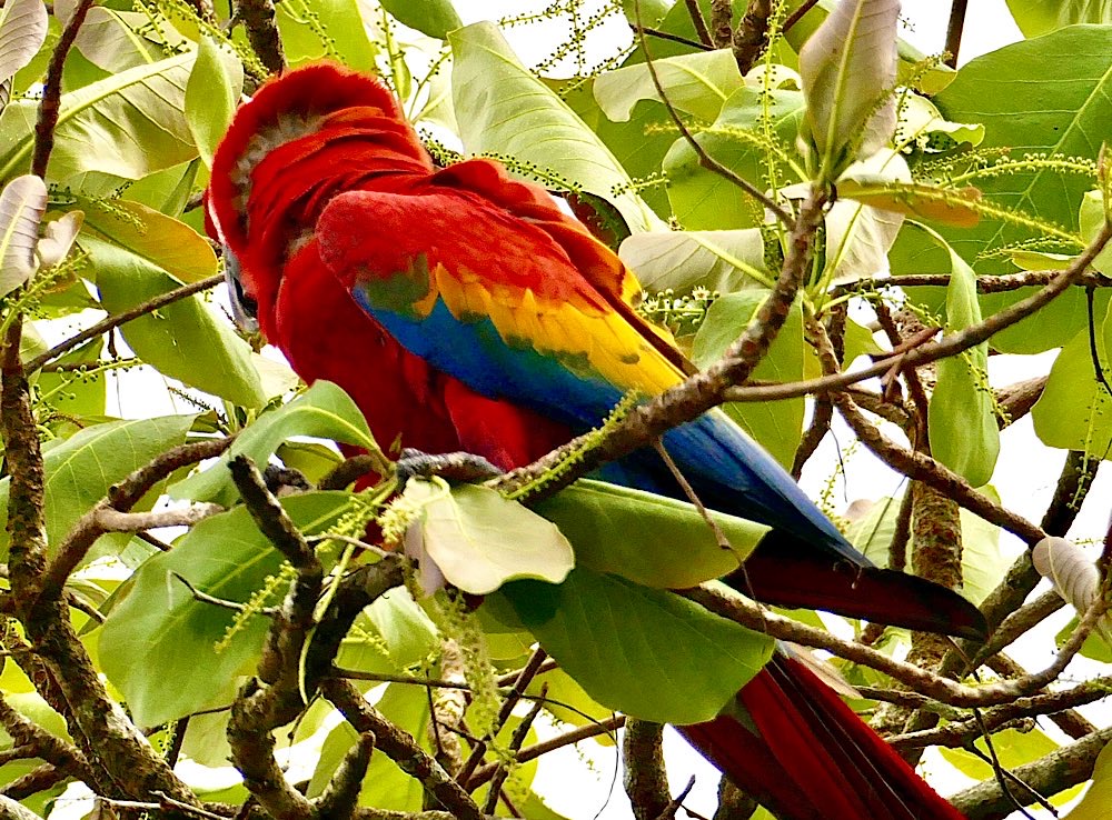 Auf dem Rückweg traf ich an der Playa Cocalito nach auf Nawit, einen thailändischen Studenten der UN, der mit einem Stipendium seit sechs Monaten im Land ist. Wir haben ein bisschen geplaudert und gemeinsam dann noch versucht, die Aras zu fotografieren, die über uns im Mandelbaum saßen.