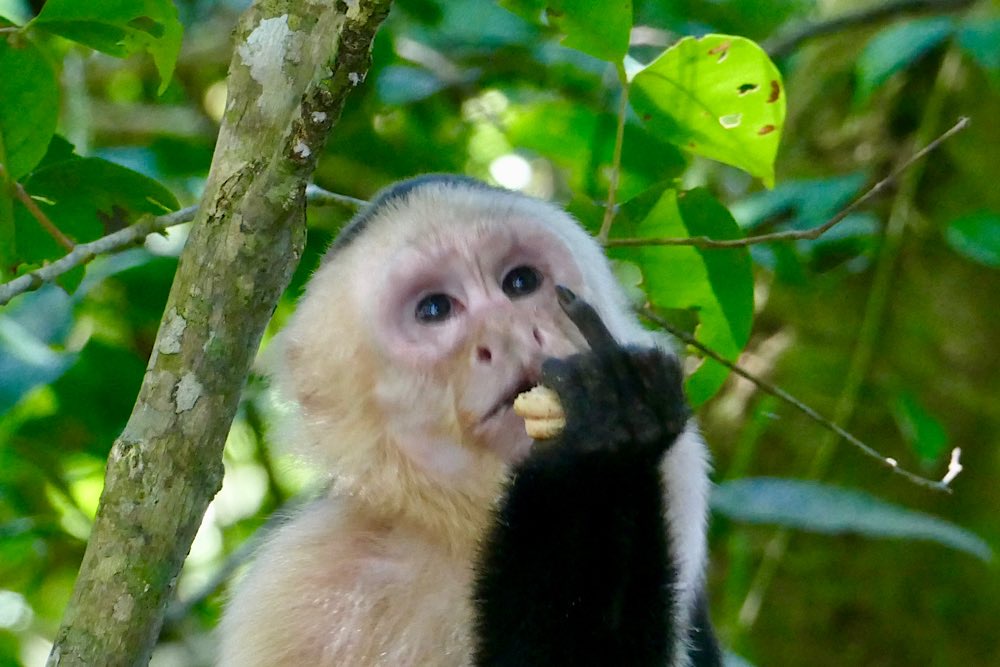Heute war es nicht ganz so heiß und sonnig hier, durchaus ein Vorteil. Der Plan für heute war, einen deutschen Expat, zu dem ich über eine Facebook-Gruppe Kontakt hatte, zu besuchen und dabei den Sendero Drake entlang zu gehen, der als Wanderweg parallel an der Küste Richtung Süden verläuft. Der Weg war richtig schön: Abenteuerliche Hängebrücken, ein kleiner Hafen, viele Stufen, schöne Buchten, auch mit Sandstränden. In der Casa Aleman gab es wunderbare Blicke auf das Meer und vor allem auf diverse Affen, die in den Bäumen herumspielten. Der Deutsche spendierte ein rohes Ei, um die Affen anzulocken, weil ich gerne fotografieren wollte. Hat auch wunderbar geklappt, allerdings waren zwei Affen da. Einer schaute dann in die Röhre, der andere hat das Ei genossen. Ganz ordentlich oben aufgeklopft und dann ausgeleckt. Am Schluss noch Finger ablecken und weiter geht der Tag. Inzwischen waren auch Mono Congos aufgetaucht, die ihren Jungen das Hüpfen von Baum zu Baum beibrachten. Alles sehr interessant zu beobachten.