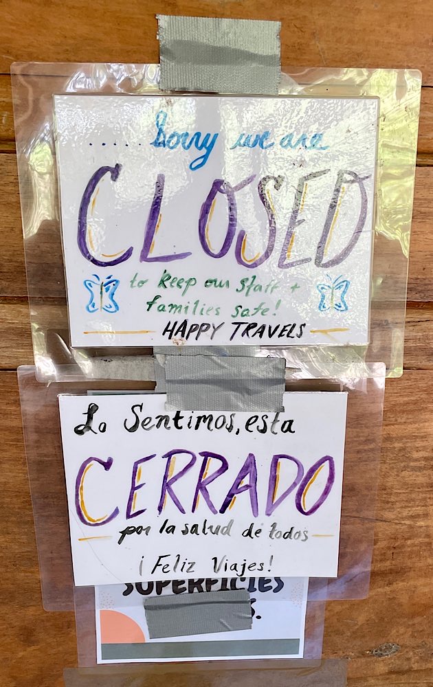 Nach einem Mittagessen im Ort wollten die meisten zum Ziplining. Ich nicht, ich hab das schon zweimal gemacht, in Honduras war es großartig, das zweite Mal weniger und die Aktion nach einem fröhlichen Abend fand ich nicht so passend für mich. Also brauchte es eine Alternative. Ich wollte in einen Schmetterlingsgarten. Nach meinen online Recherchen war nicht ganz klar ob er offen hatte oder nicht. Es sah mir so aus, als würde er schon um 14:30 Uhr schließen. Also bestellte ich mir ein Taxi im Supermarkt, um die verbleibende Stunde noch zu nutzen. Das hat dann leider alles nicht so richtig geklappt. Der Taxista wollte 2500 Colones, mein Guide hatte mir mit auf den Weg gegeben, wieviel für welchen Streckenabschnitt jeweils der höchste Preis wäre. Also nachverhandelt, 2000 Colones. Abgeladen am Schmetterlingspark musste ich feststellen, dass dieser zu hatte, ganz, wegen Pandemie. Dann im selben Taxi wieder zurück in den Ort beziehungsweise zum Hotel. Dort ein weiterer Disput um Preise – die Rezeptionistin des kleinen Hotels unterstützte mich auch mit einem Telefonat, egal, der Typ blieb unangenehm und hat seine Kohle bekommen. Es scheint hier zwei Taxi-Unternehmen zu geben, das höchste legale der roten Taxis und ein anderes, das wohl vorwiegend von den Einheimischen genutzt wird, eher halb legal, der Taxifahrer nannte sie „piratas“.