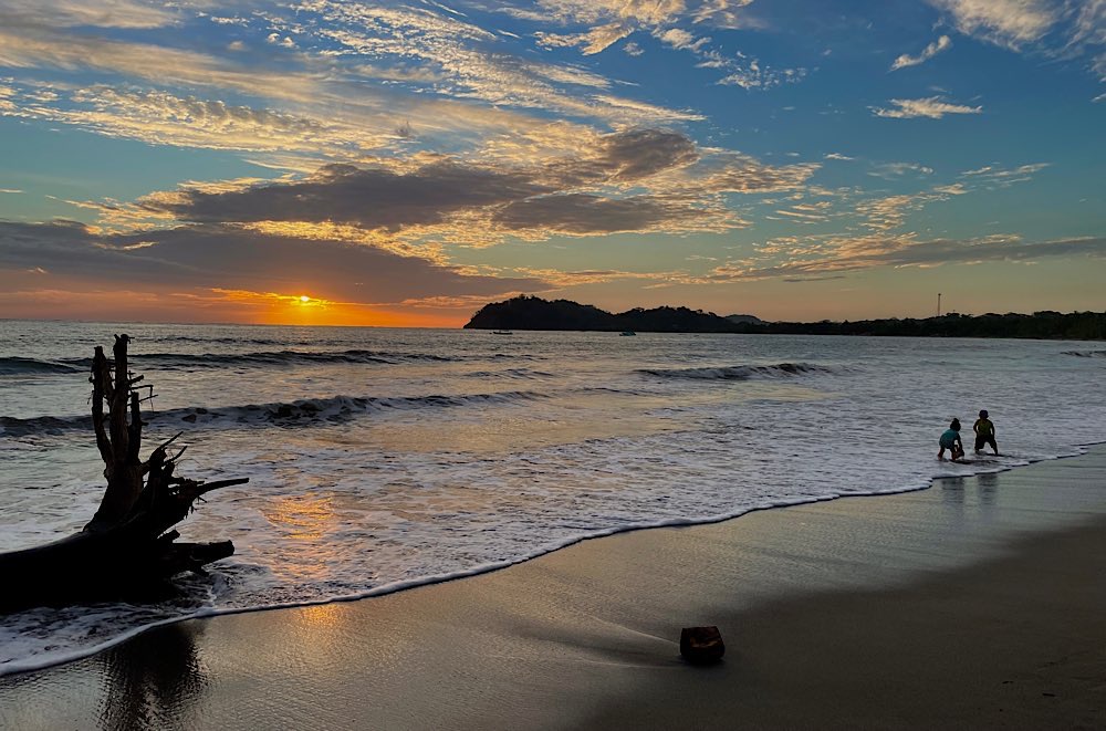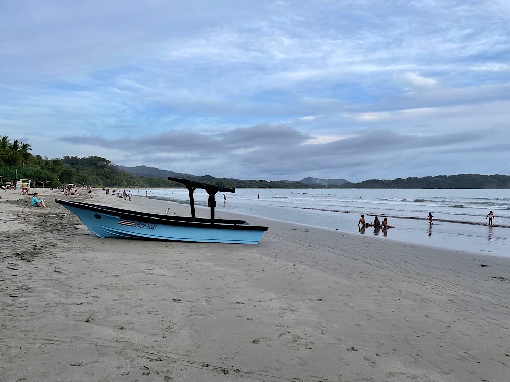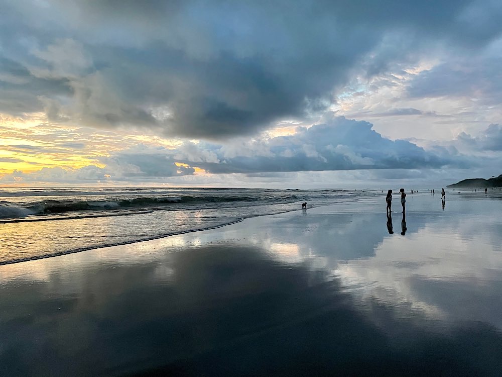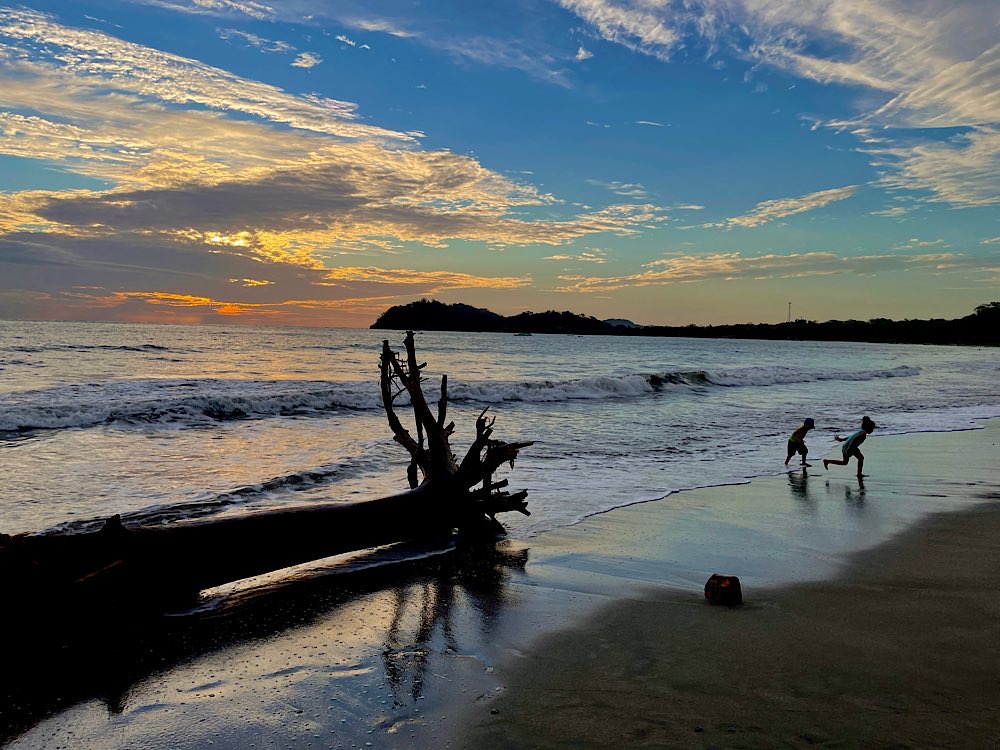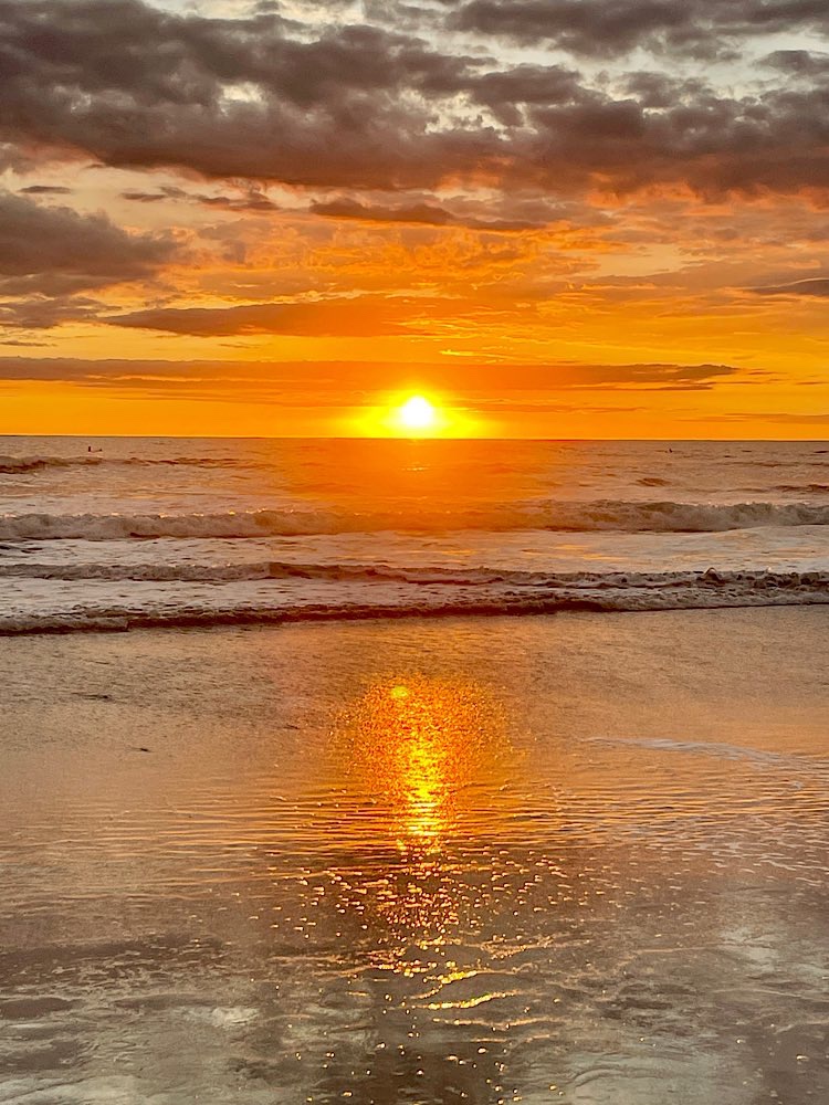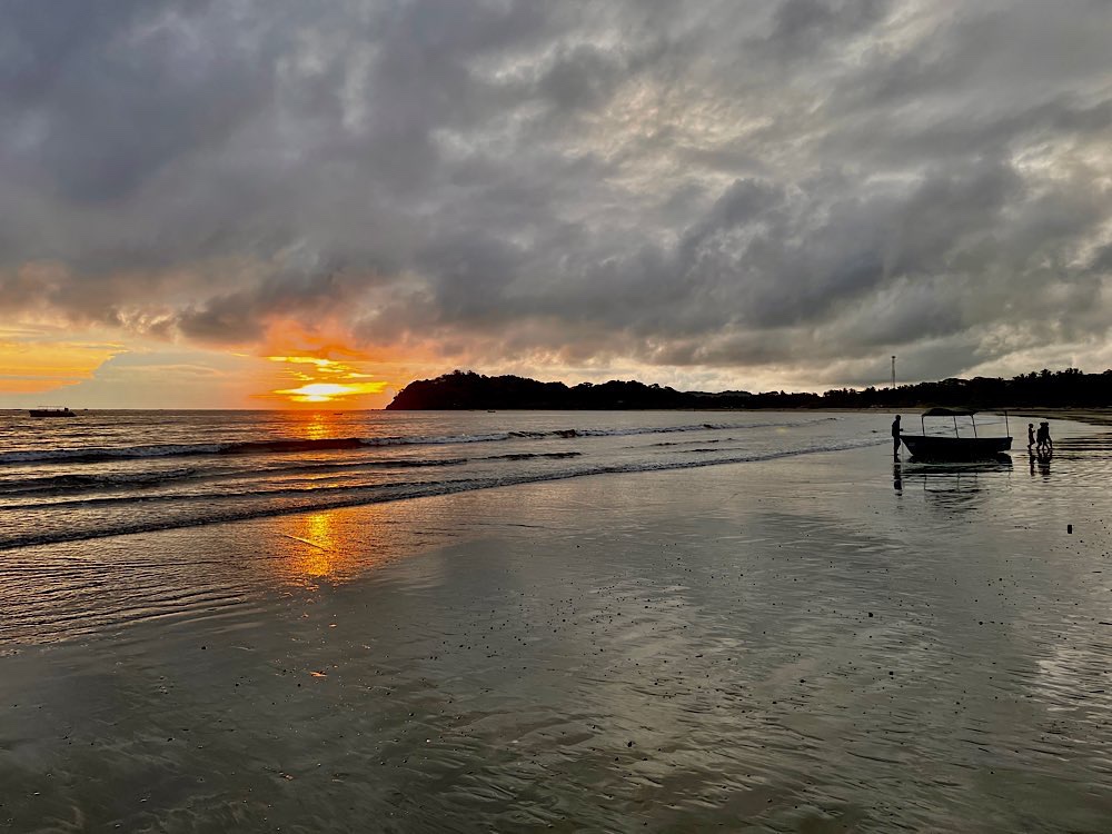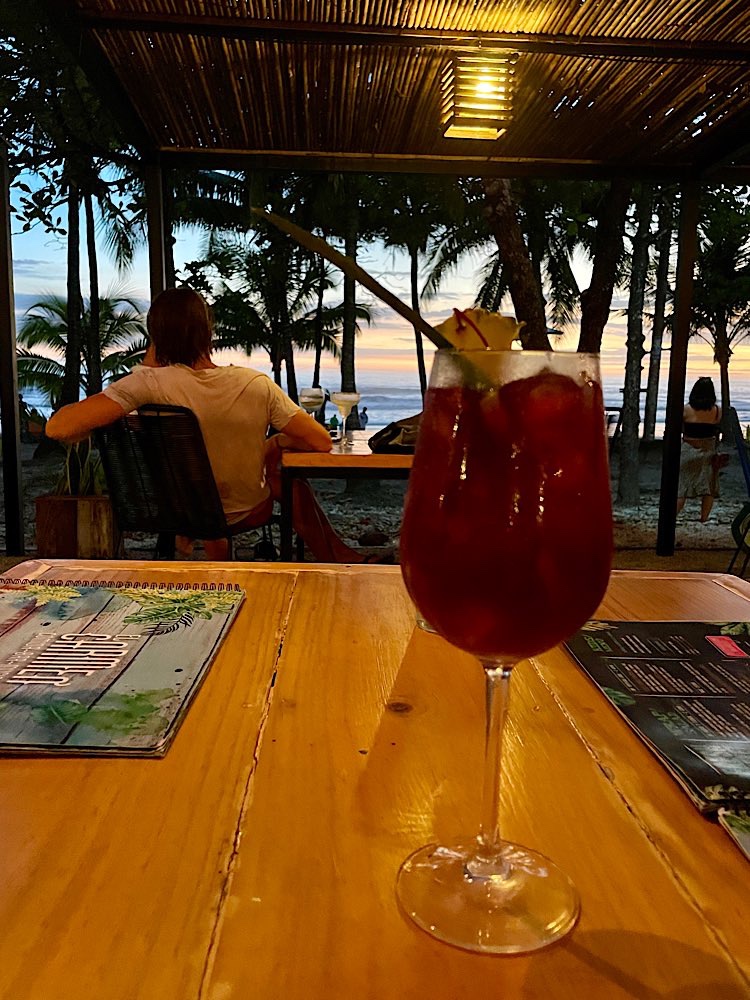 Melina, die ich über eine Facebook Gruppe kennen gelernt habe und mit der ich hier ein Zimmer teile, wünscht sich was anderes zum Frühstück, das gibt es dann ab morgen. Tagsüber ist auf alle Fälle Strand angesagt, herrliche Pazifikwellen laden zum Baden ein und Surfer der Schule neben an versuchen sich mit den Wellen. Ansonsten bietet das kleine Örtchen entspannte Lokalitäten und kleine Geschäfte, mal was essen, mal ein Cocktail, eine schöne Zeit haben mit Melina und Laura, die für längere Zeit hier in Costa Rica ist und auch zu unserem generationsübergreifenden Dreier-Reiseteam gehört. Wir haben jedenfalls unseren Spaß und genießen – Pura Vida eben😎 Und die Sonnenuntergänge sind auch ganz hübsch🌄