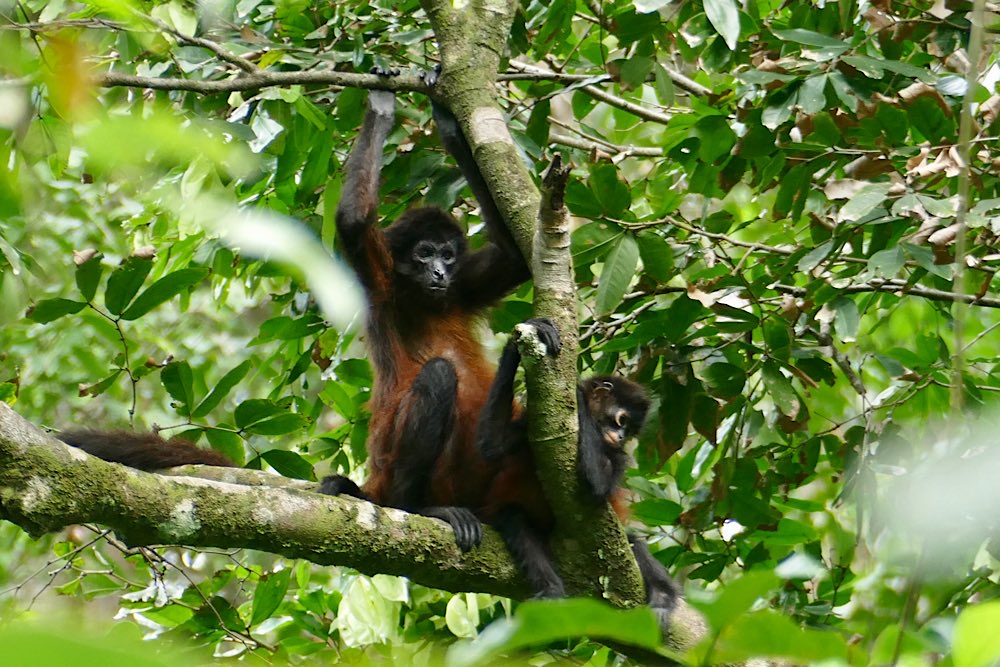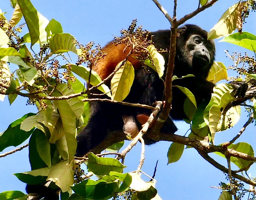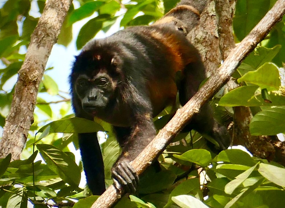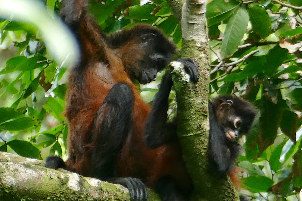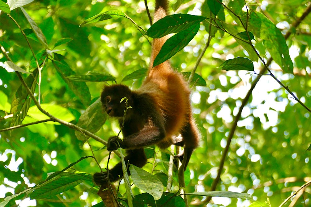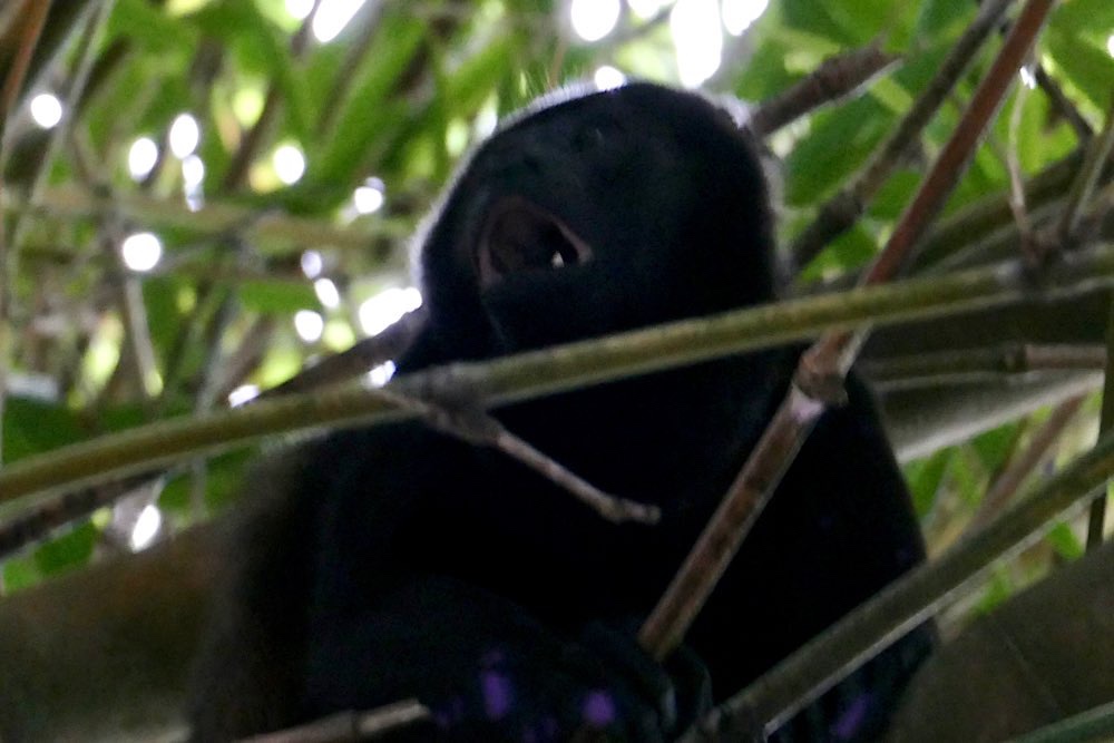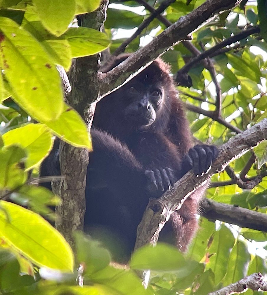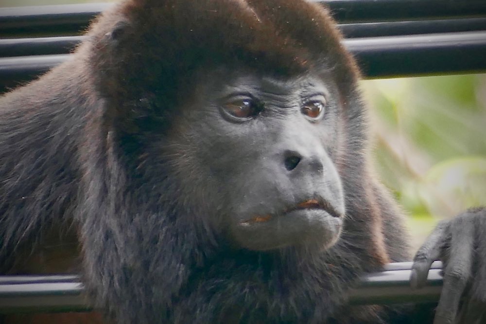 Unsere Unterkunft Luz de Luna liegt wieder knapp 100 m ins Land hinein von der Straße weg im „Urwaldgarten“. Gestern morgen gab es Affentheater von etwa 10 Kapuzineräffchen um 6 Uhr morgens gleich hinter meinem Schlafzimmerfenster. Heute morgen begann das Spektakel schon um 5 – Brüllaffen (Mono Congo) gaben ein kräftiges Konzert – an Schlaf war nicht mehr zu denken. Die Lautstärke war unglaublich – irgendwas zwischen Hundebellen und sonorem Wolfsgeheule. Ich hab ein bisschen gegoogelt, wollte eigentlich den Sound hier wiedergeben können, aber alles im Netz klang viel zahmer als das, was wir hier erlebt haben. Zum Gebrüll überhaupt gab es dann überall die gleiche Info: Je tiefer das Gebrüll desto kleiner die Hoden – ok – interessante Info jedenfalls 😉