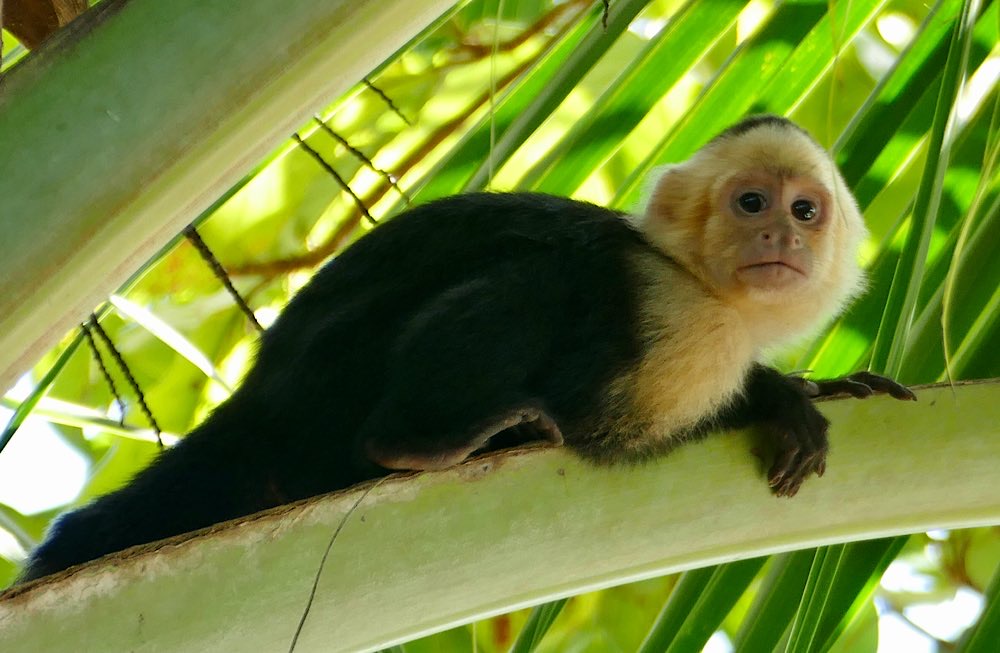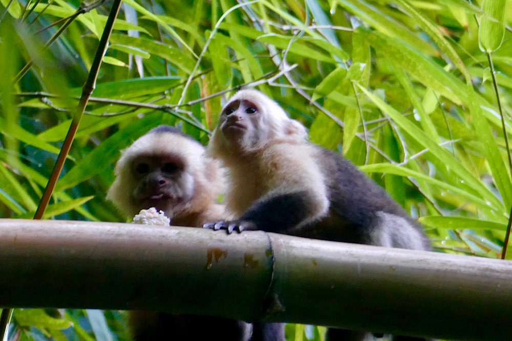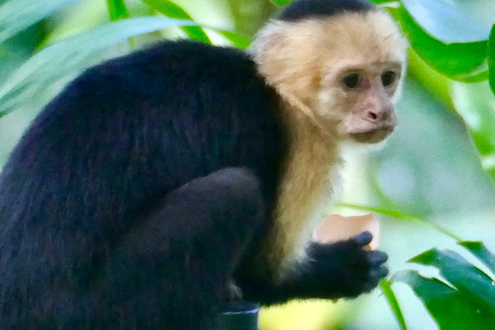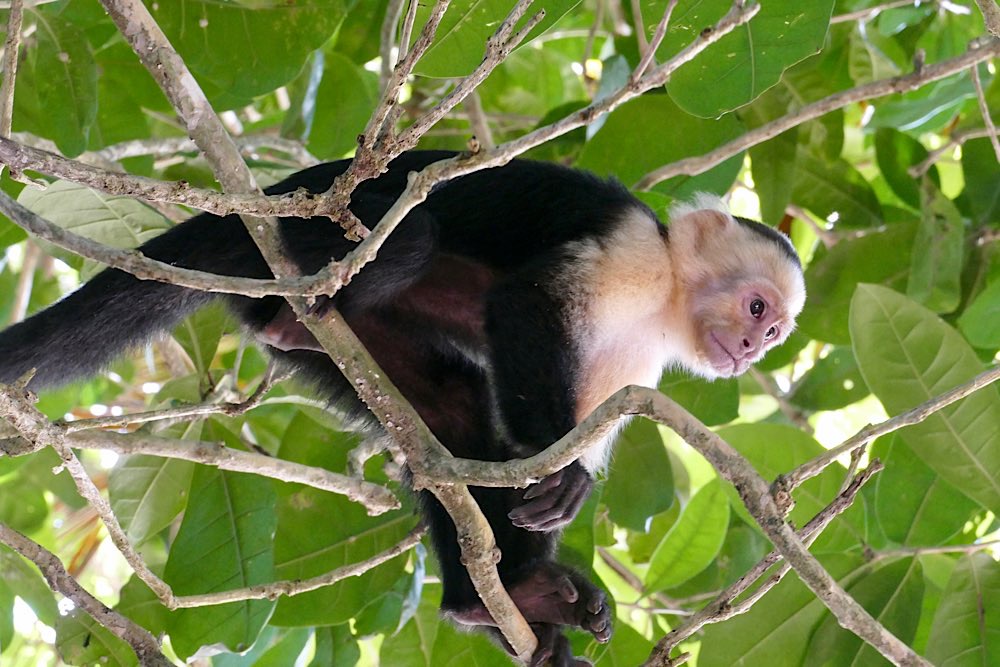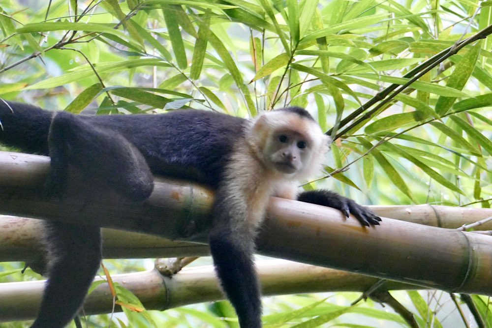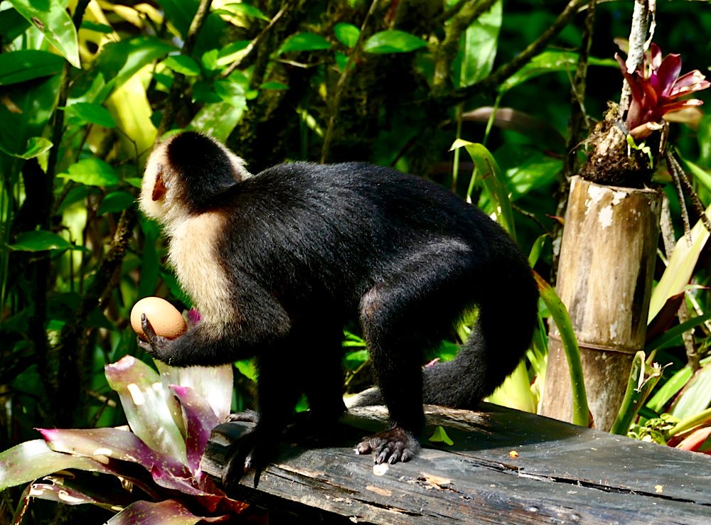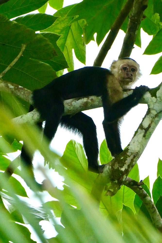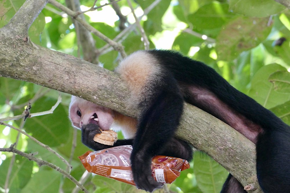 Heute war es nicht ganz so heiß und sonnig hier, durchaus ein Vorteil. Der Plan für heute war, einen deutschen Expat, zu dem ich über eine Facebook-Gruppe Kontakt hatte, zu besuchen und dabei den Sendero Drake entlang zu gehen, der als Wanderweg parallel an der Küste Richtung Süden verläuft. Der Weg war richtig schön: Abenteuerliche Hängebrücken, ein kleiner Hafen, viele Stufen, schöne Buchten, auch mit Sandstränden. In der Casa Aleman gab es wunderbare Blicke auf das Meer und vor allem auf diverse Affen, die in den Bäumen herumspielten. Der Deutsche spendierte ein rohes Ei, um die Affen anzulocken, weil ich gerne fotografieren wollte. Hat auch wunderbar geklappt, allerdings waren zwei Affen da. Einer schaute dann in die Röhre, der andere hat das Ei genossen. Ganz ordentlich oben aufgeklopft und dann ausgeleckt. Am Schluss noch Finger ablecken und weiter geht der Tag. Inzwischen waren auch Mono Congos aufgetaucht, die ihren Jungen das Hüpfen von Baum zu Baum beibrachten. Alles sehr interessant zu beobachten.