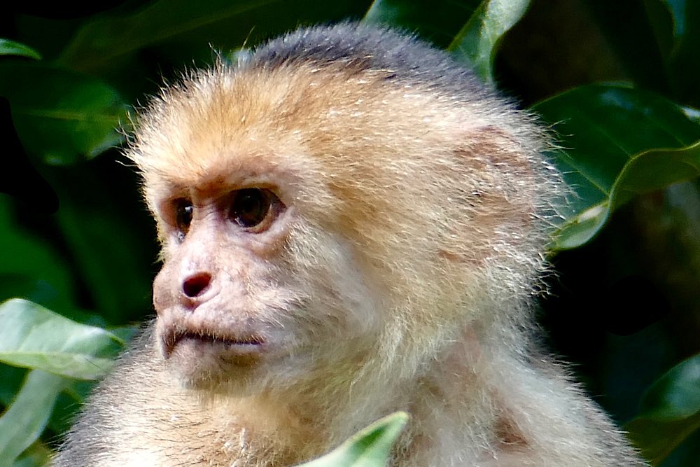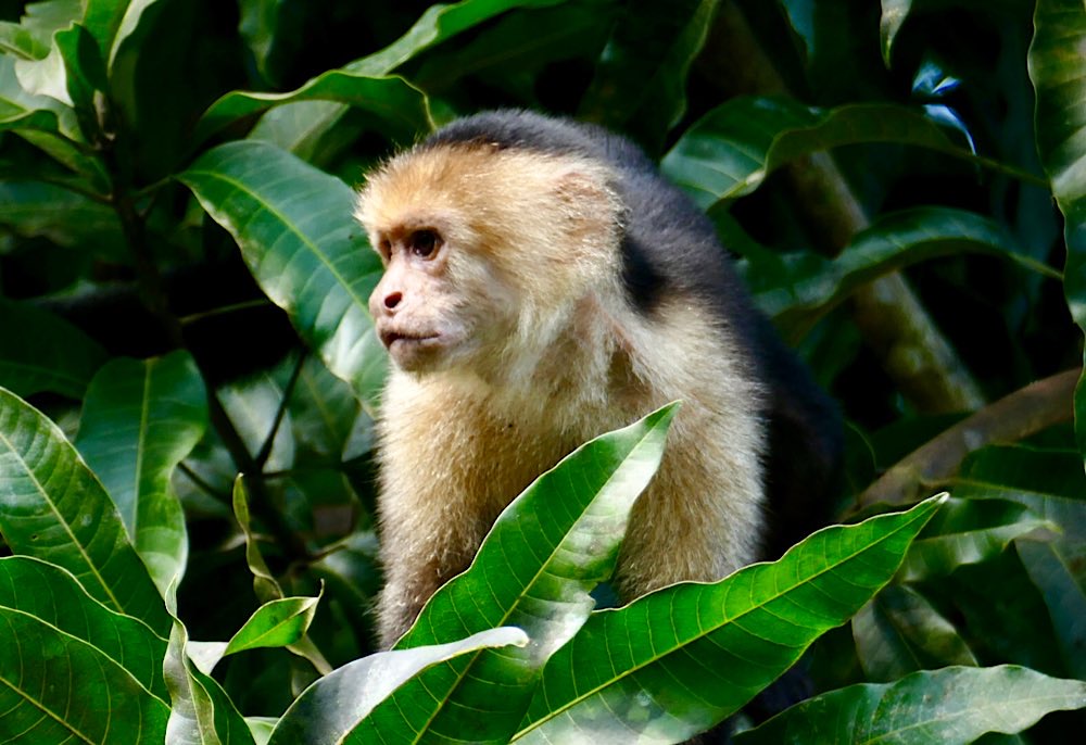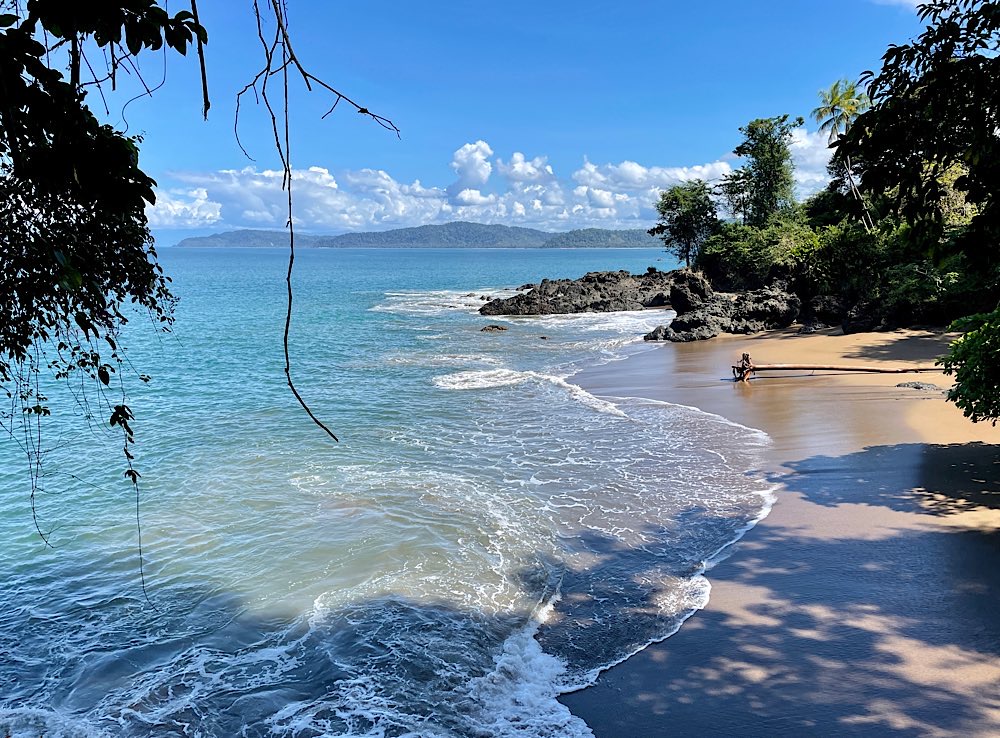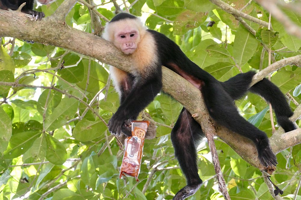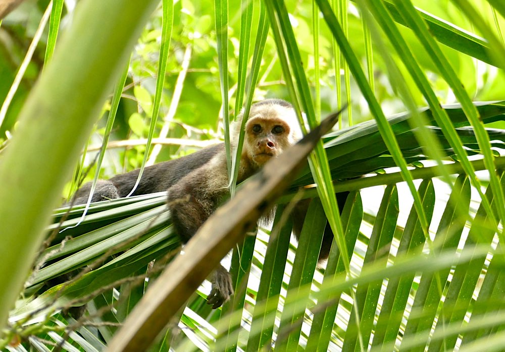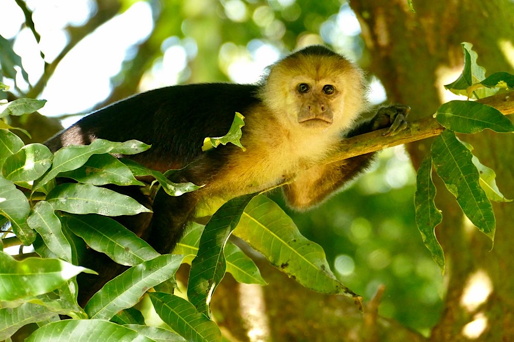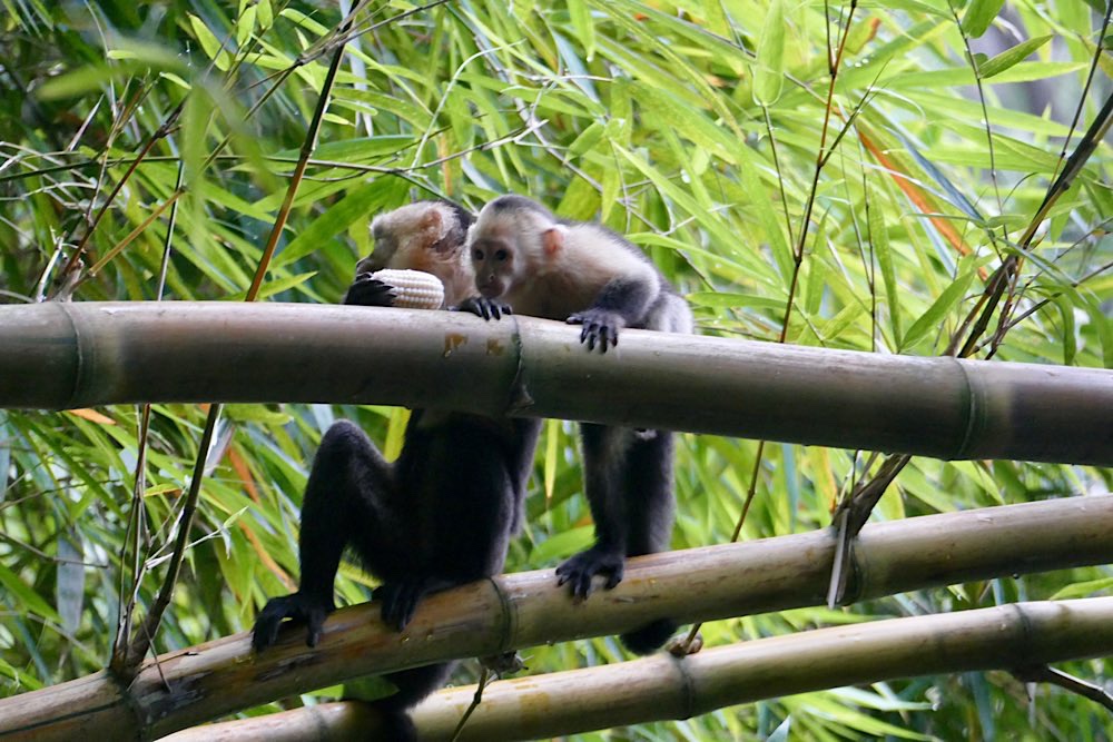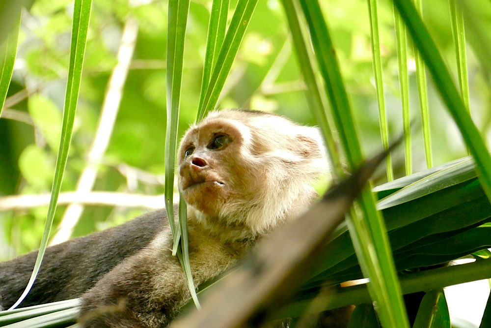 Heute war es nicht ganz so heiß und sonnig hier, durchaus ein Vorteil. Der Plan für heute war, einen deutschen Expat, zu dem ich über eine Facebook-Gruppe Kontakt hatte, zu besuchen und dabei den Sendero Drake entlang zu gehen, der als Wanderweg parallel an der Küste Richtung Süden verläuft. Der Weg war richtig schön: Abenteuerliche Hängebrücken, ein kleiner Hafen, viele Stufen, schöne Buchten, auch mit Sandstränden. In der Casa Aleman gab es wunderbare Blicke auf das Meer und vor allem auf diverse Affen, die in den Bäumen herumspielten. Der Deutsche spendierte ein rohes Ei, um die Affen anzulocken, weil ich gerne fotografieren wollte. Hat auch wunderbar geklappt, allerdings waren zwei Affen da. Einer schaute dann in die Röhre, der andere hat das Ei genossen. Ganz ordentlich oben aufgeklopft und dann ausgeleckt. Am Schluss noch Finger ablecken und weiter geht der Tag. Inzwischen waren auch Mono Congos aufgetaucht, die ihren Jungen das Hüpfen von Baum zu Baum beibrachten. Alles sehr interessant zu beobachten.