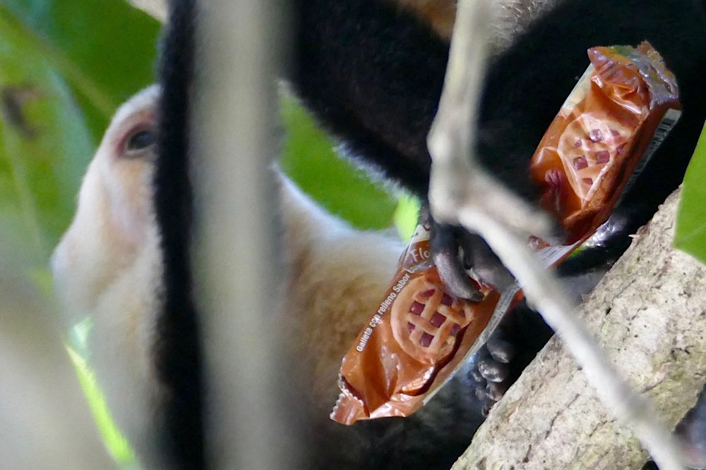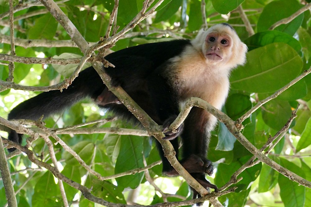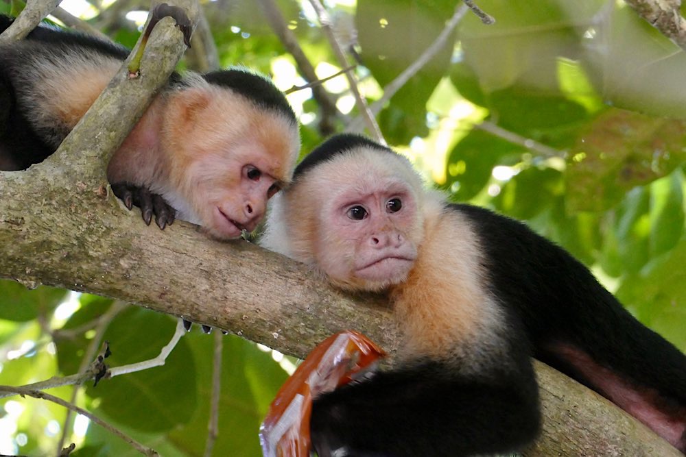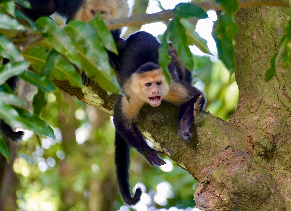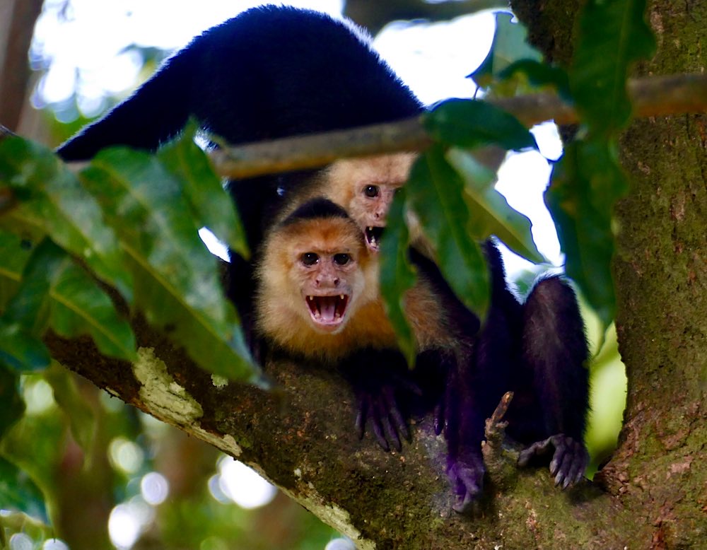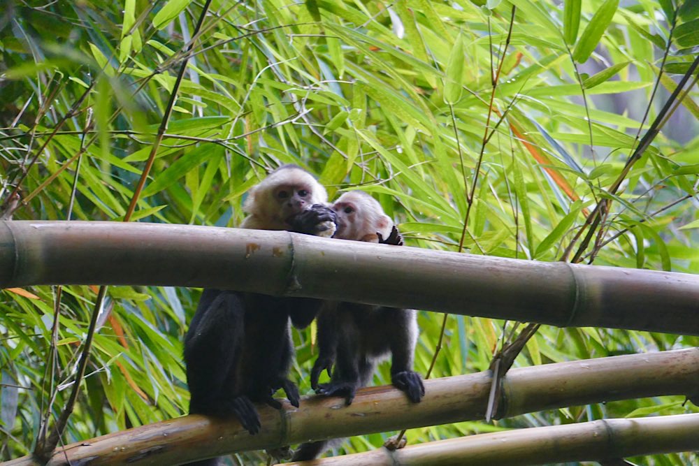 Auch viele Kapuzineraffen waren unterwegs. Ihr liebstes Spiel ist es, den zahlreichen Touristen etwas abzunehmen, Kekse sind dabei sehr beliebt.