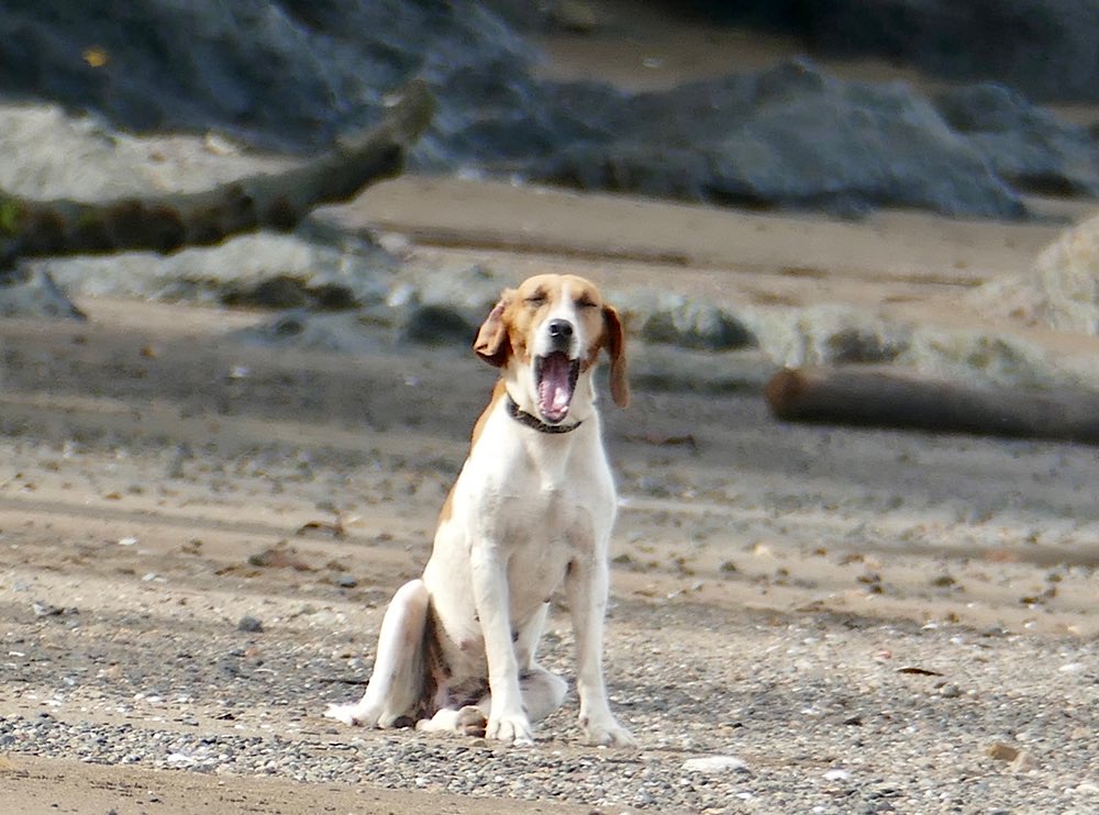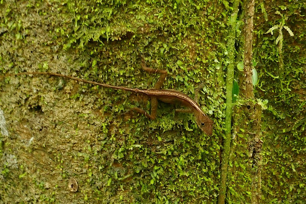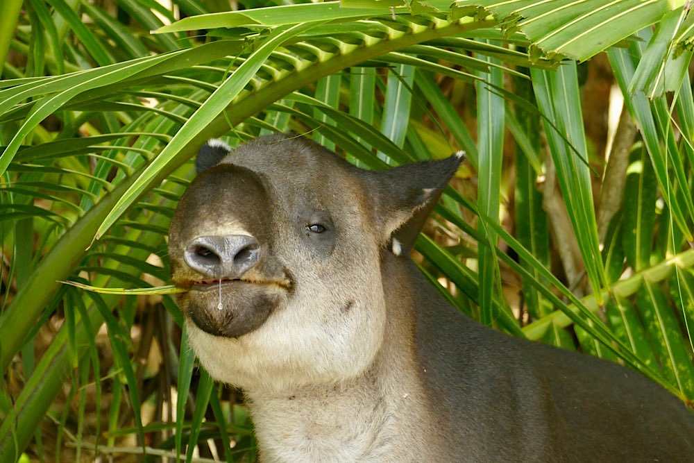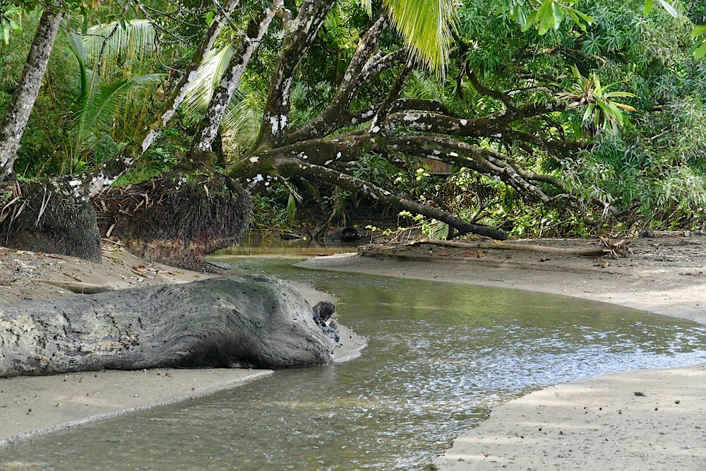 Ich war einigermaßen nervös vor dem Nationalpark, da ich wusste, dass die Wanderung hart sein soll. Die zwei Kanadier, die auch noch dabei sein sollten, hatten kurzfristig gecancelt. So war ich dann doch alleine mit meinem Guide, Angel. Er hat einen beachtlichen Redefluss, die anderthalb Stunden der Fahrt über Stock und Stein, auf sehr schlechter Straße, durch einige Flussläufe, unterhielt er den Fahrer permanent. Dieser brauchte nicht viel zu sagen und tat es auch nicht. Um 7:40 Uhr ging es schließlich in Carate am Flughafen los. Also an der Landebahn, vom Flughafen sah man sonst nichts. Nach 1 Stunde waren wir dann in La Leona, Eintritt in den Nationalpark, registrieren und so weiter, schon 3,5 km geschafft, anstrengend, aber ging. Meine Hochrechnung, wann wir etwa ankommen könnten, ging nach hinten raus dann aber gar nicht auf. Der Weg wurde immer beschwerlicher, entweder in der Hitze am Strand durch den tiefen Sand oder auf dem Parallelweg, zunächst noch eben, später extrem wellig. Unterwegs wurde immer mal wieder Halt gemacht, wenn Angel etwas entdeckt hatte. Das Teleskop, dass alle Guides mit sich führen, wurde dann aufgestellt und etwas scharf gestellt, manchmal war’s dann aber auch schon wieder weg, zumindest bei den Vögeln und Affen war das so. Von den vier Affenarten, haben wir drei gesehen, den Mono Congo nicht, nur gehört, aber den kannte ich ja schon. Das absolute Highlight war aber eine Begegnung am Strand. Angel meinte, ich solle mal meine Kamera aus dem Rucksack holen. Habe ich brav gemacht, hat sich absolut gelohnt: am Waldrand graste ein junger Tapir, absolut entzückend und auch ein wenig fotogen. Also, grasen war es eigentlich nicht was er tat, er fraß Palmenblätter, war in aller Ruhe und mit Leib und Seele am Futtern. Zwei Franzosen waren auch gerade da, drei Kameras, er ließ sich nicht stören, erst als er satt war, ging es weiter.