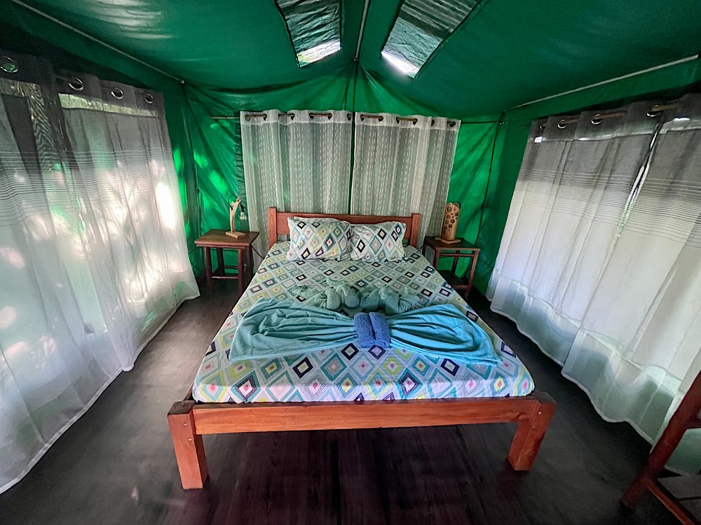 Von La Fortuna aus hatte uns unser Weg zunächst ins Zeltcamp Pozo Azul in Sarapiqui geführt. Dort lebten wir abgeschieden von der Zivilisation in recht komfortablen Zelten mit Doppelbetten, Strom und privatem Badezimmer. Der Dschungel war akustisch immer präsent – hier das Heulen und Bellen von Mono Congos, dort die Rufe der Tukane und anderer Vögel.