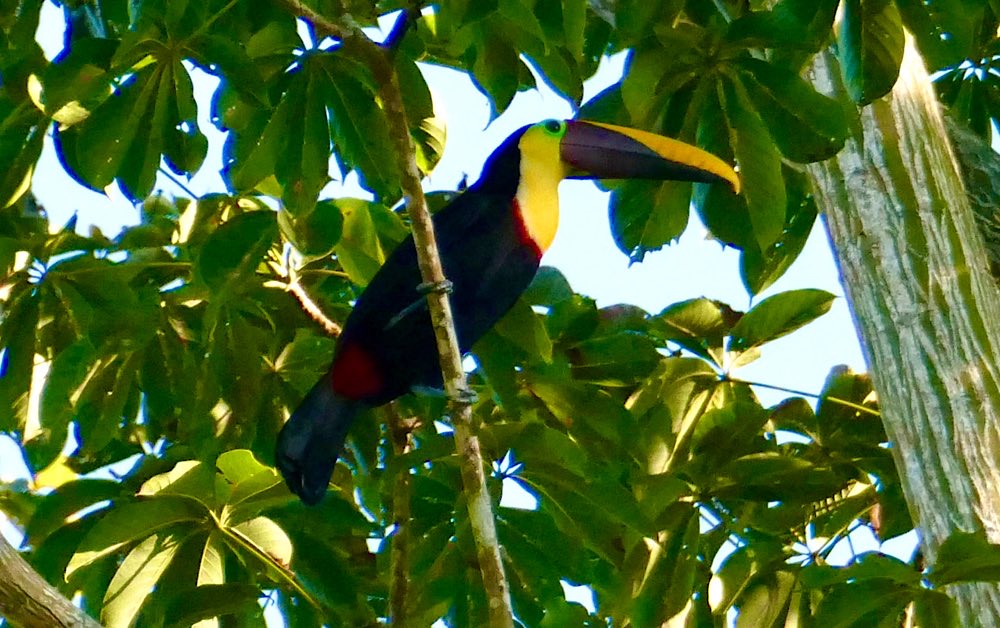 Ich gewöhne mich so langsam ein ins Dschungelleben. Nach dem Aufwachen beim ersten Blick aus dem Fenster sind da Kapuzineräffchen. Gestern Abend hab ich meinen ersten Tukan gesehen, womit ein sehnlicher Wunsch auch ohne Betreten eines Nationalparks hier in Erfüllung ging. Leider saß der Gute in beträchtlicher Entfernung auf geschätzten 35-40m Höhe, also doch recht weit weg. Mit etwas Nachbearbeitung ist das Foto aber noch brauchbar, denke ich und inzwischen weiß ich, wie die nächsten Fotos besser werden 😉