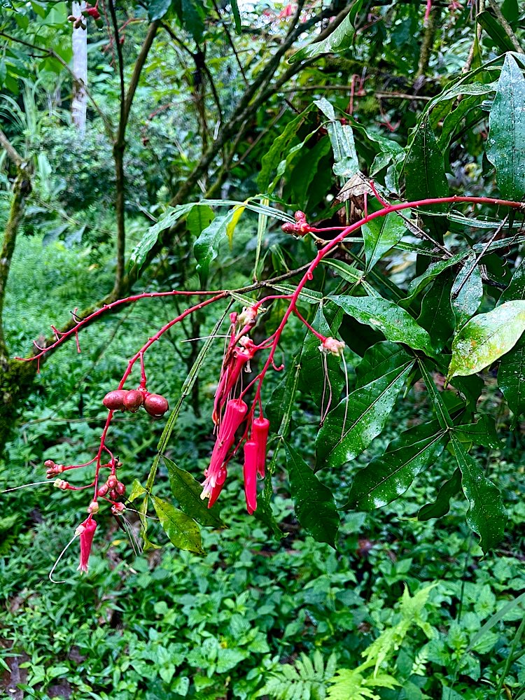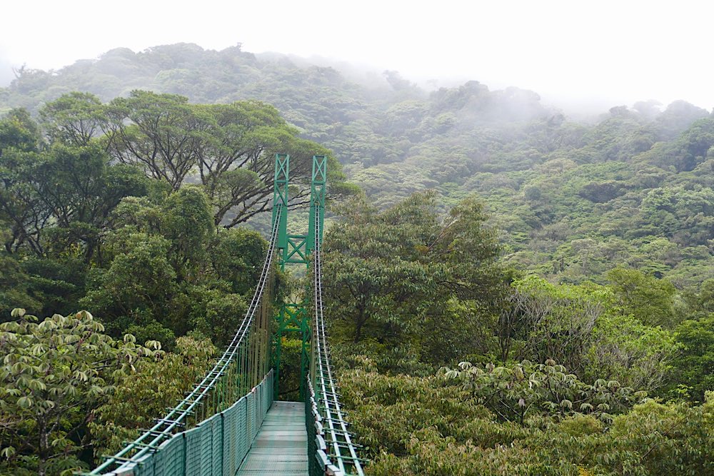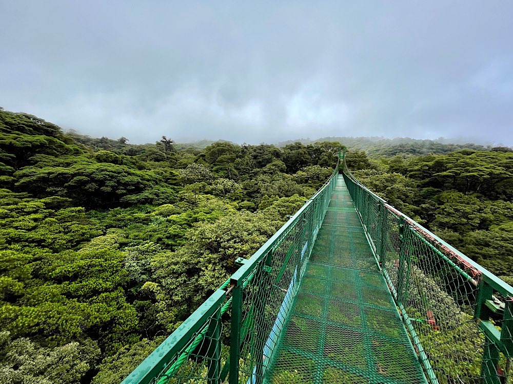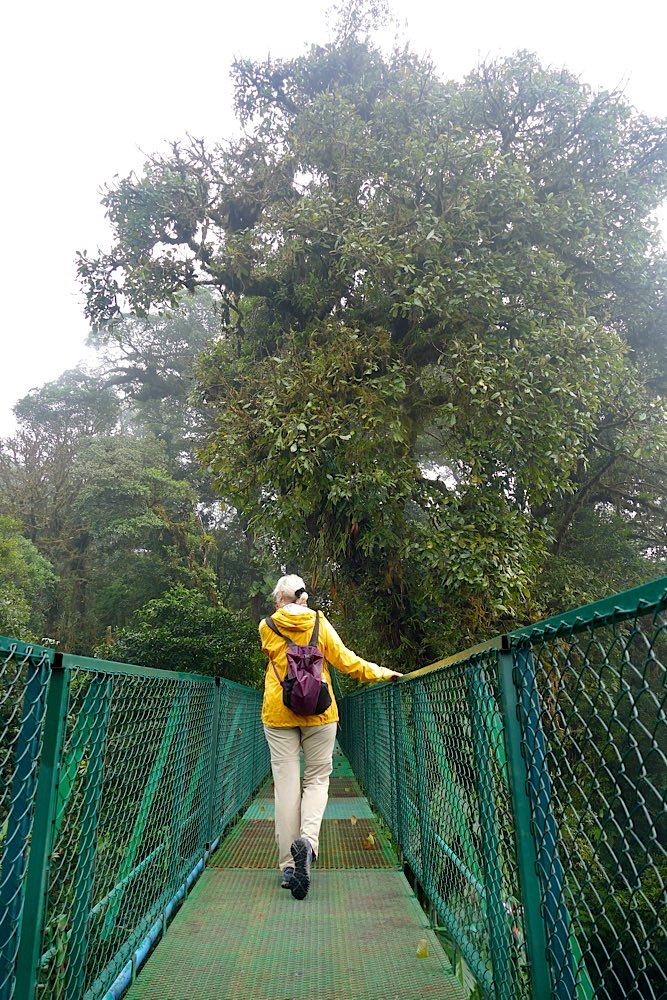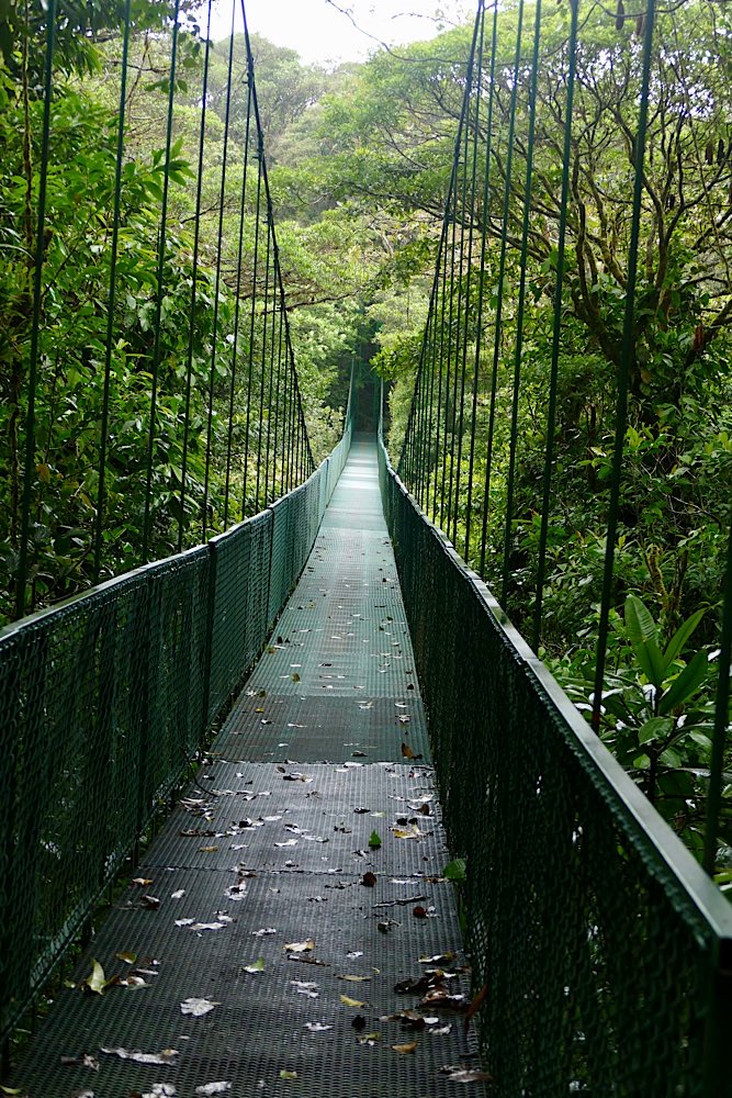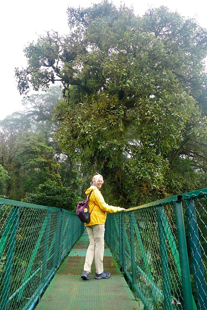 Heute Früh ging es dann hinauf in den Nebelwald von Monteverde. Wegen der hier aufeinander treffenden Klimazonen ist das Wetter eigentlich immer gleich, recht kühl, windig, ständiger Nieselregen. Das führt zu starker Überwucherung der Bäume im Sekundärwald und zu einer sehr hohen Artenvielfalt. Eine besondere Attraktion hier sind die Hängebrücken.