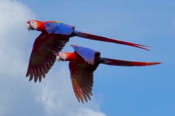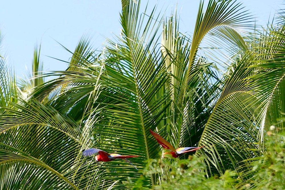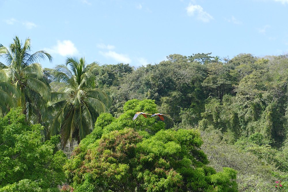 In den nächsten Ort beziehungsweise Strand weiter südlich wollte ich mit dem Bus fahren. Hat alles soweit geklappt, wenn man davon absieht, dass der Bus über 1 Stunde Verspätung hatte. Der Los-Verkäufer, der auch nach Puerto Carrillo wollte, erklärte mir, der Bus hätte ein Problem, es würde heute länger dauern. Okay, nicht wirklich schlimm, ich habe hier ja keinen Stress. Anstrengend wurde es nur kurzfristig, als Andrea in den Bus stieg und sich zu mir gesellte. Sie wohnt auch im Belvedere, ist aber offensichtlich leicht verwirrt und etwas anstrengend. Sie wusste weder, wohin der Bus fuhr, noch wann zurück, noch, dass man sich das Ticket vorher kauft. Nach zehn gemeinsamen Minuten am Aussichtspunkt im Zielort traf sie aber eine gute Entscheidung, nämlich den Rest des Tages ohne mich zu verbringen. Mir reichte durchaus die Begleitung durch meine Kamera – da bietet sich immer mal wieder ein neues Motiv. Diesmal hatte ich Glück und habe rote Aras im Flug erwischt, nicht perfekt, aber ich war happy.