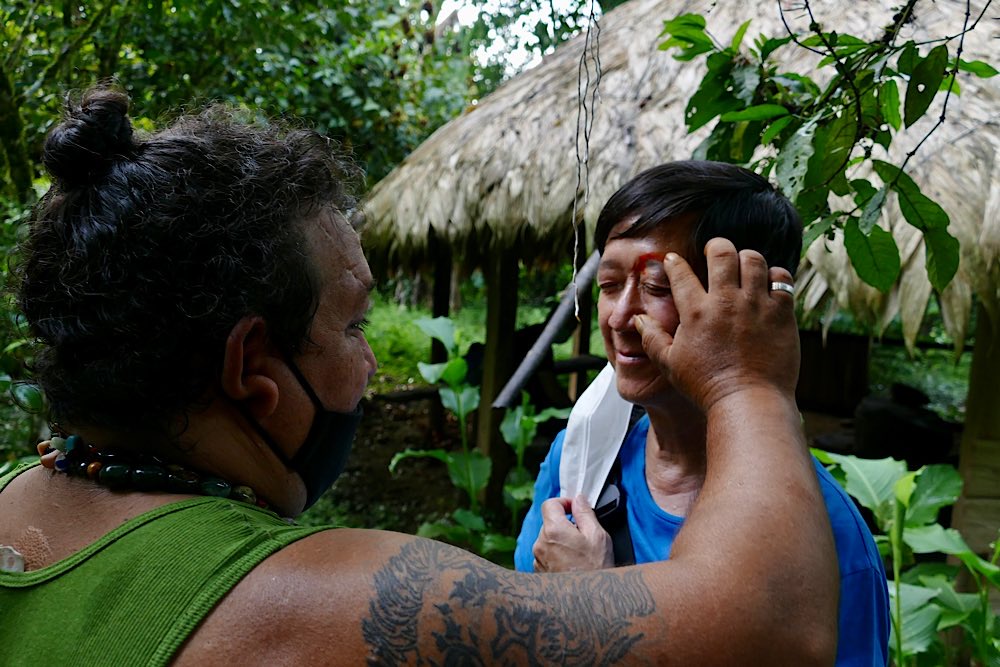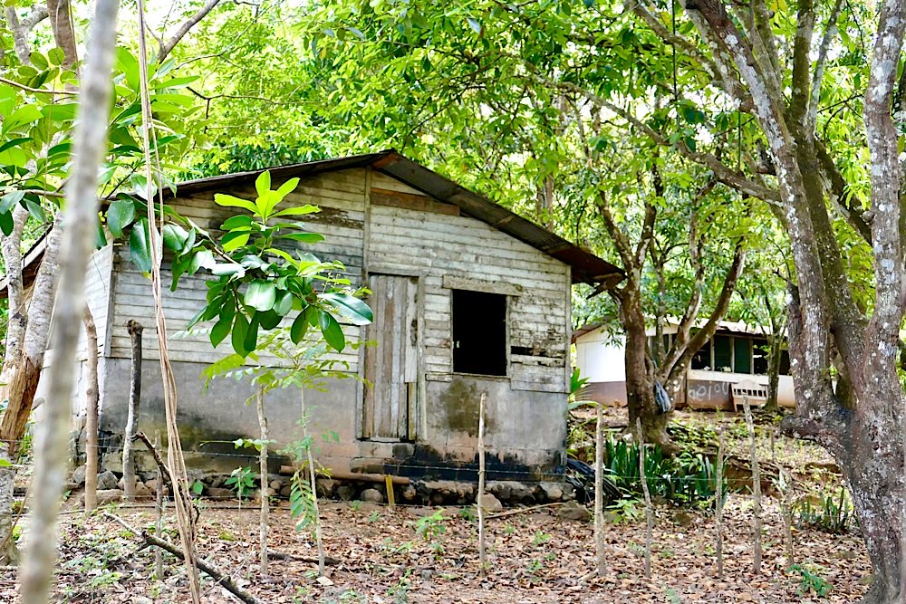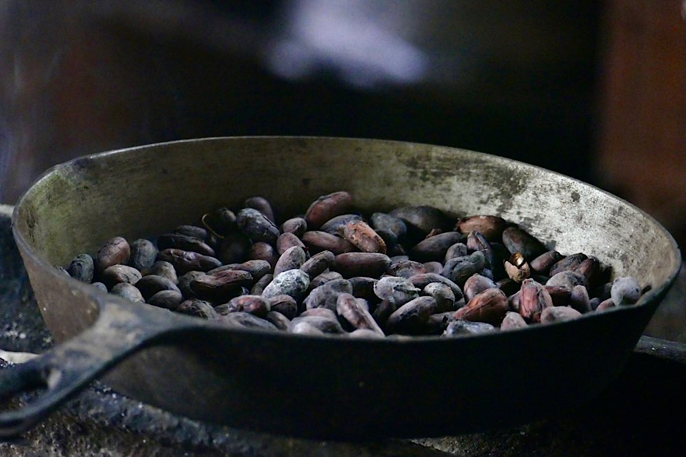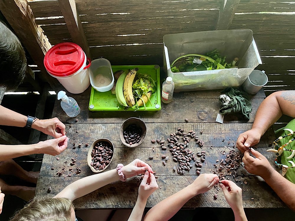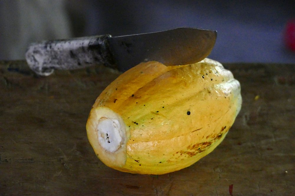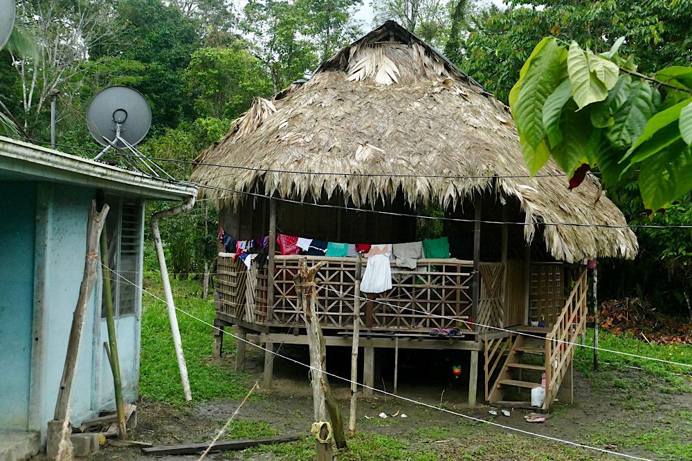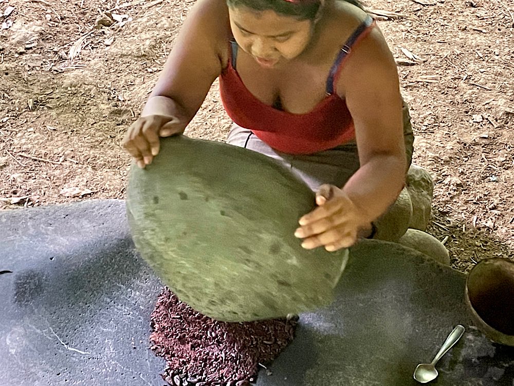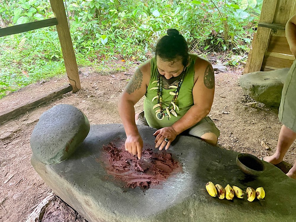 Für den Nachmittag stand ein Besuch bei den Bribri auf dem Programm, einem indigenen Volk. Luis begrüßte uns, Schuhe ausziehen und hinauf in den Wohnraum und die Küche der zentralen Hütte hieß es. Ungewohntes Gehen auf dem Fußboden, hergestellt aus Hölzern einer Palme, viele Lücken und nicht besonders stabil. Gewöhnungsbedürftig. Wir durften fotografieren und dann zusehen, wie aus der Kakaopflanze Schokolade hergestellt wird. Mariecella, die Tochter von Louis, durfte uns dann zeigen, wie die Kakaobohnen auf einem großen Stein zermahlen werden. Wir durften auch alle mal probieren. Wem es gelang, war heiratsfähig😉.